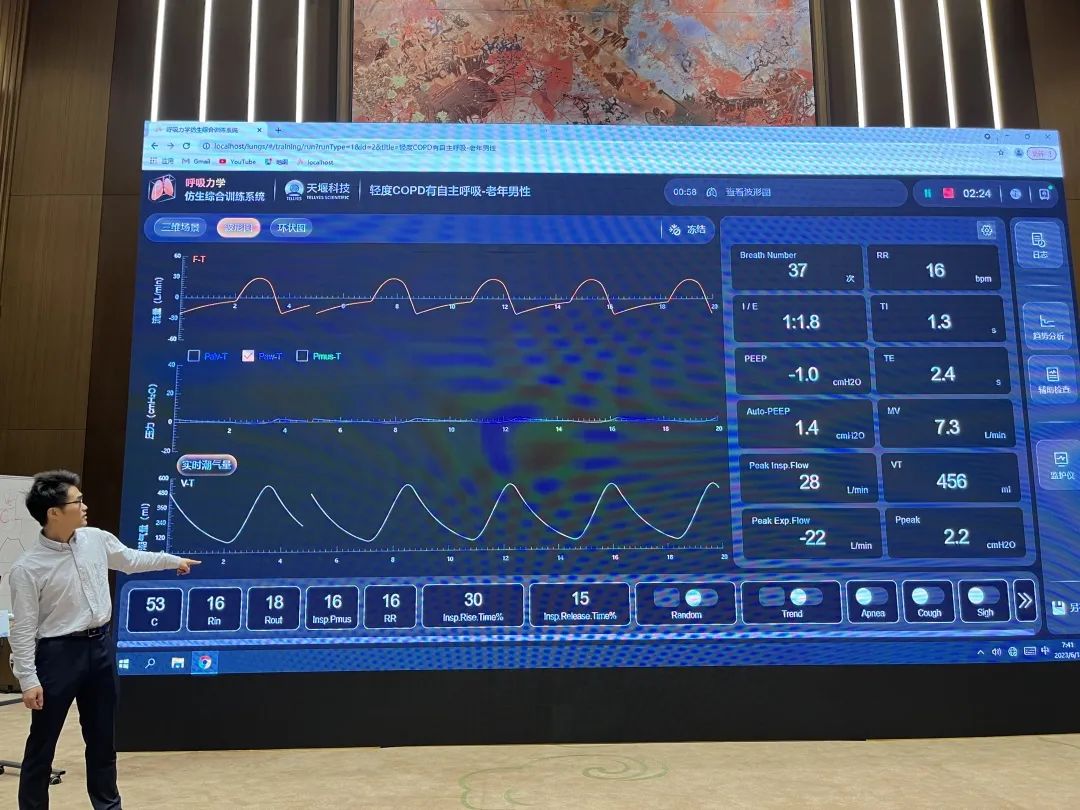 此外,来自中国科学技术大学附属第一医院(安徽省立医院)的金魁主任在讲授主旨为“异常波形分析”的论坛讲座时,使用了天堰科技“模拟肺”内置的呼吸力学模型——“轻度COPD有自主呼吸 老年男性”,帮助参会学员更好的理解存在肺部疾病患者机械通气时通气波形的特点及监测参数异常改变。金魁主任对“模拟肺”给予了高度肯定,并建议学员课后有时间都可以进行实操训练。